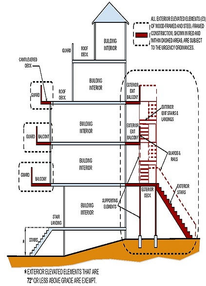 SB 326, which went into effect on January 1, 2020, requires all balconies, decks, walkways, stairs, and railings that are 6 feet or more above ground level in CIDs to be inspected visually by a licensed structural engineer or architect. The inspection must be completed no later than six years after the building's certificate of occupancy is issued. If the building was constructed before January 1, 2020, the inspection must be completed no later than six years after January 1, 2020.